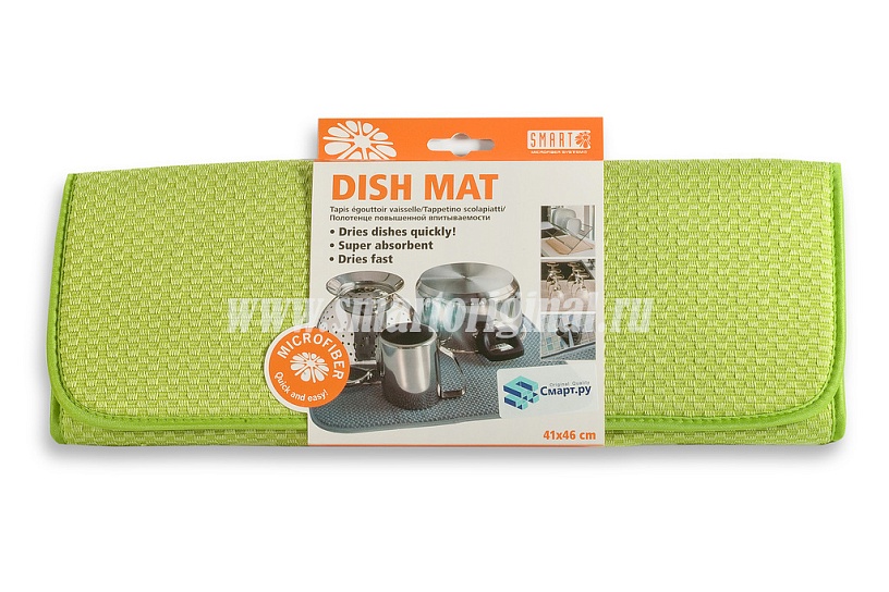 Коврик для сушки посуды прекрасно впитывает влагу. Жидкость не растекается по поверхности, а полностью остается внутри коврика. Коврик для посуды при намокании очень быстро высыхает. На коврике для сушки посуды есть удобная петелька, которая позволяет подвесить коврик и быстро его просушить. Коврик для посуды изготовлен из микрорезанного микроволокна шведской компании SMART, используется для просушивания на нем вымытой посуды. На коврике быстро сохнут фрукты, овощи и зелень. Благодаря высокой впитываемости материала и уникальному наполнителю, коврик прекрасно удерживает влагу.