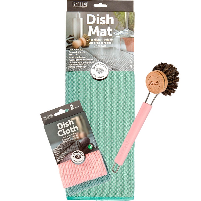 В Набор «Подарочный» входят Коврик для посуды, 2 ребристые салфетки для уборки и дизайнерская щетка для посуды серии «Natur» (натуральная щетина).