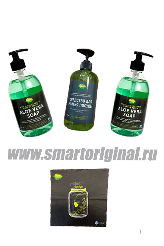 В набор входят: Жидкое мыло Алоэ Вера 500 мл (2шт.) и Средство для мытья посуды "Свежий лимон" (1шт.)