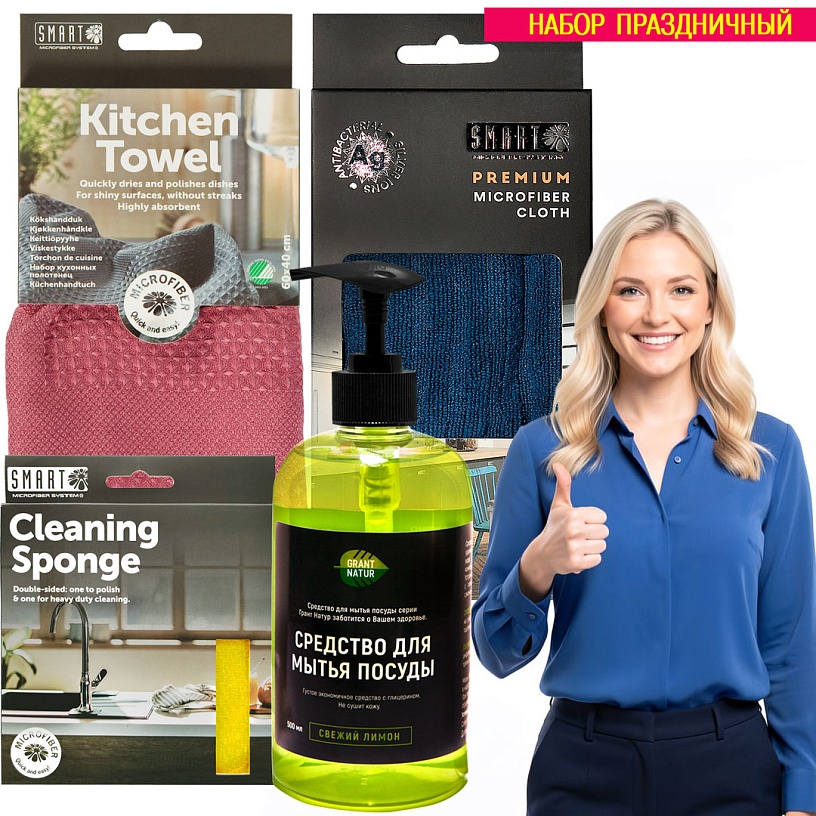 «Набор Праздничный №10» — это коллаборация шведского качества и здравого смысла. Мы собрали лучшее из каталогов SMART MICROFIBER SYSTEM и «Грант Натур»: антибактериальную технологию с ионами серебра, профессиональную кухонную салфетку «Блеск», эргономичную губку для посуды и экологичное средство «Свежий лимон». Четыре продукта, которые делают кухню местом силы, а не зоной риска.