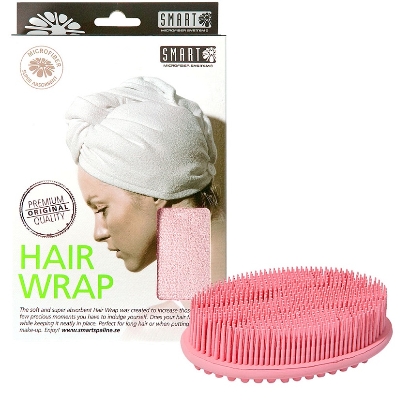 Очаровательный набор для душа: супервпитывающий тюрбан для волос шведского бренда Smart и популярная двусторонняя щетка для тела Душ-Массаж производства немецкой компании Sweepa.