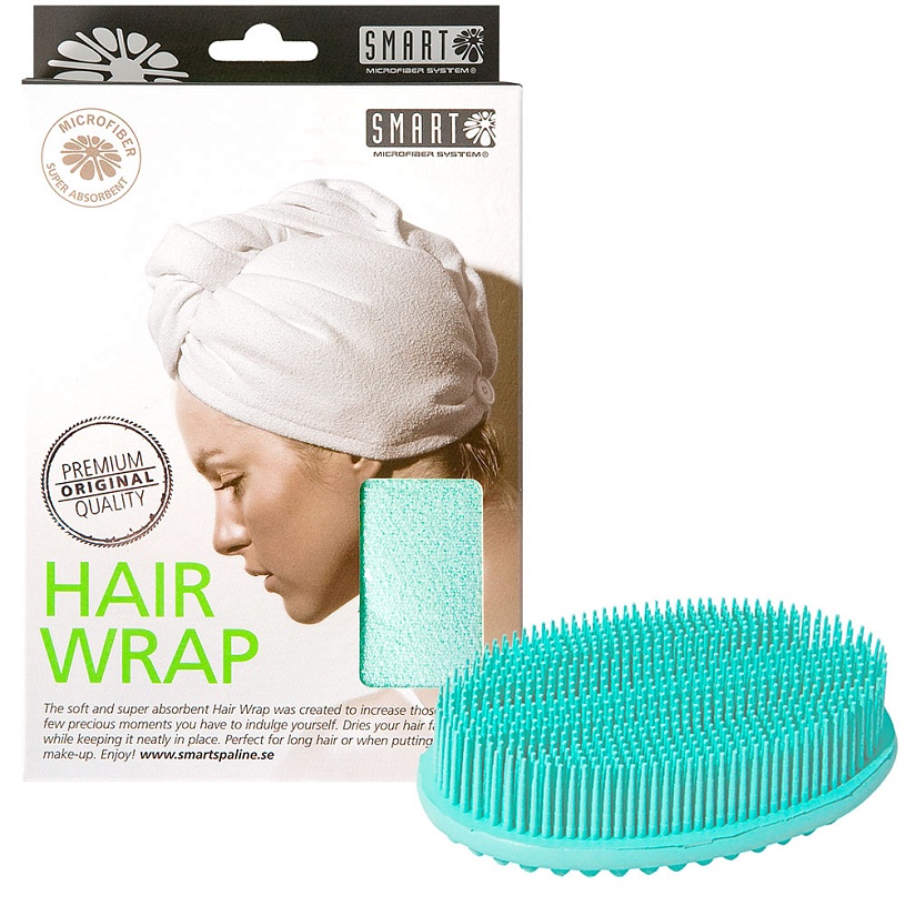 Очаровательный набор для душа: супервпитывающий тюрбан для волос шведского бренда Smart и популярная двусторонняя щетка для тела Душ-Массаж производства немецкой компании Sweepa.